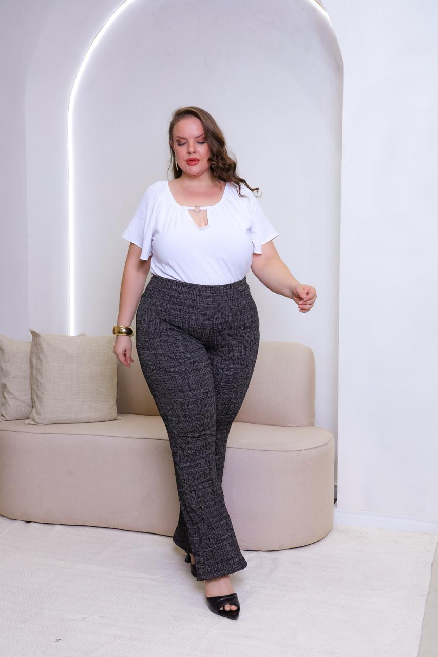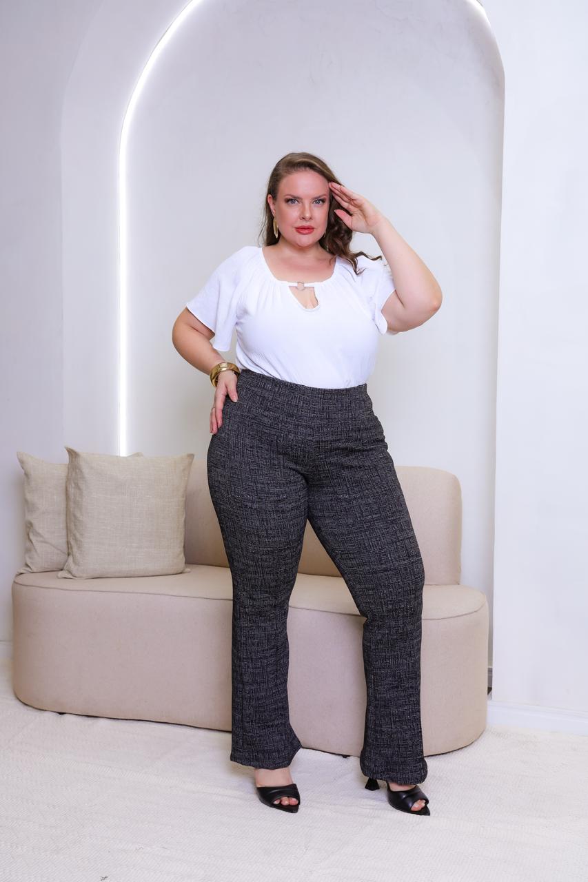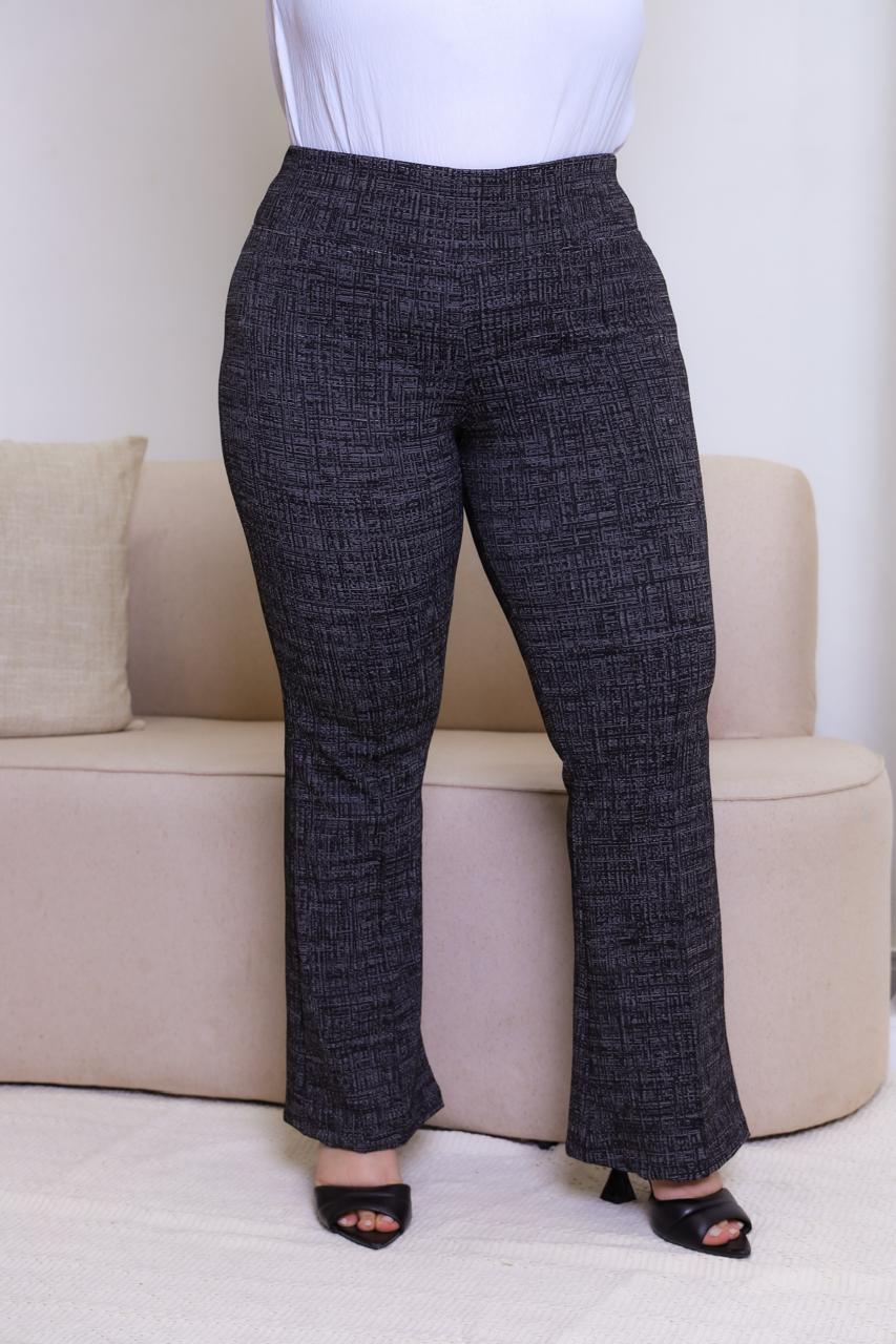 Calça Flare Jacquard Linho Plus Size com Bolso Traseiro